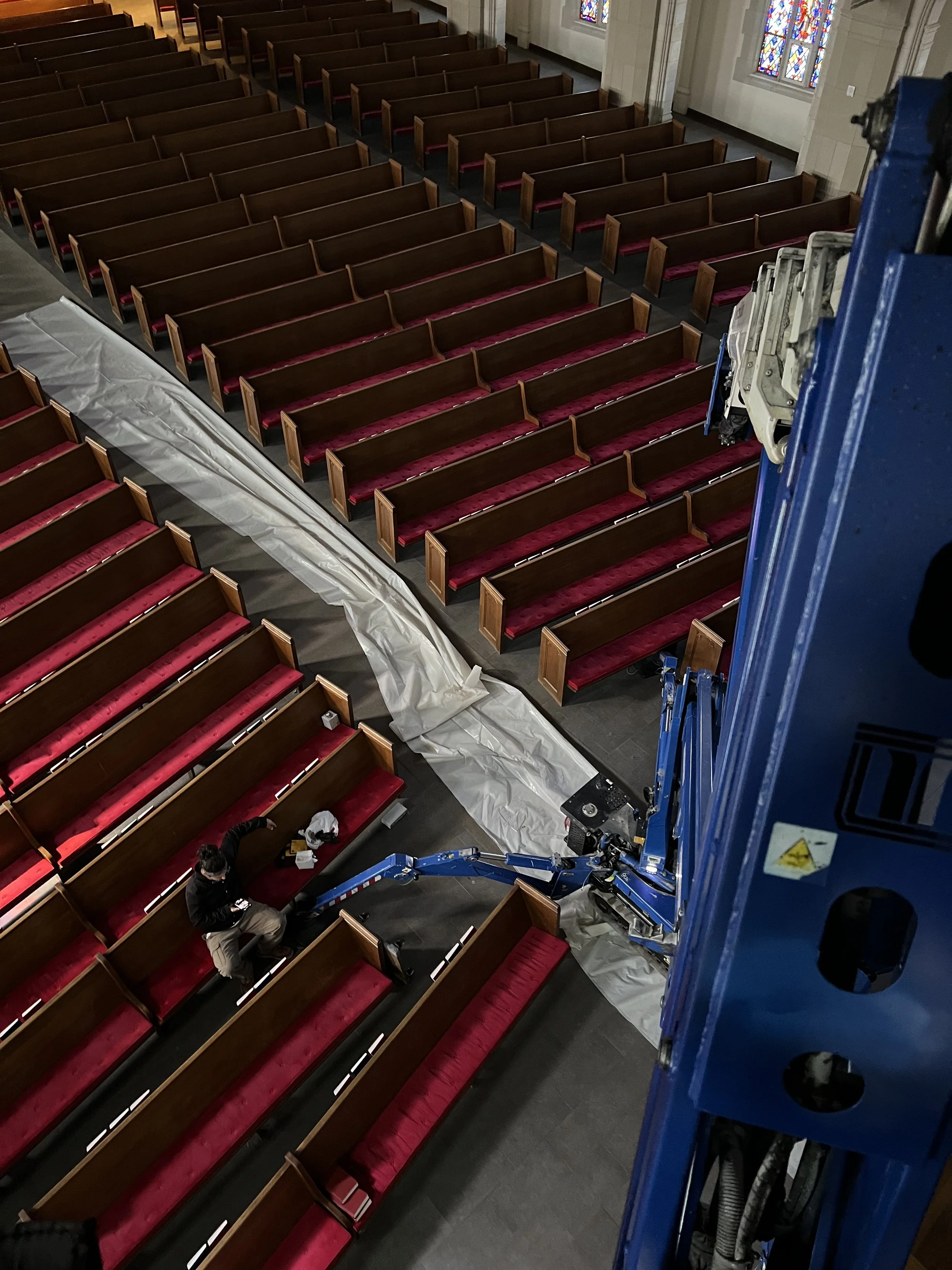 I have nothing against these lanterns, and as old as they are, they have held up remarkably over the years. Especially considering the fact that they were made out of foam core, and tissue paper. It's pretty impressive they survived as long as they did. However, you can see from the picture above, they are just a tad bit small, and kind of get swallowed up by all the poinsettias around them on the organ ledge. I say "small," but they're actually quite large—just not large enough to compete with the scale of the rest of the room.